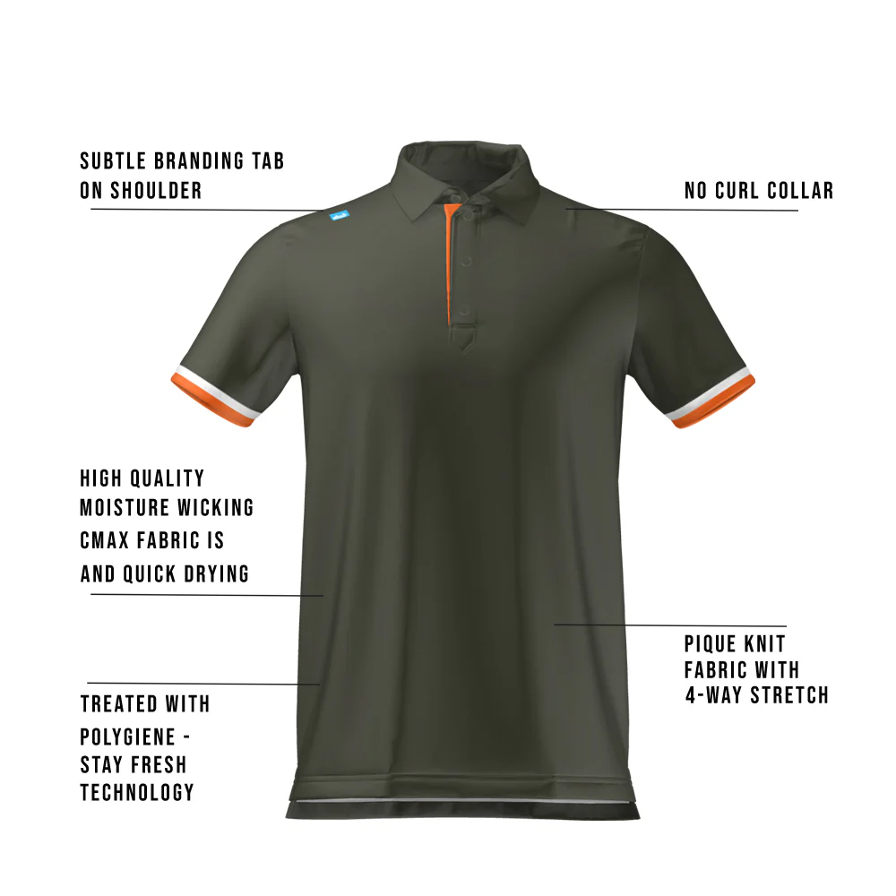 Designed with a Khaki Green block body, featuring a Khaki, Orange and White sleeve cuff stripe and an Orange under placket. Bunker Flag on shoulder seam for subtle branding.