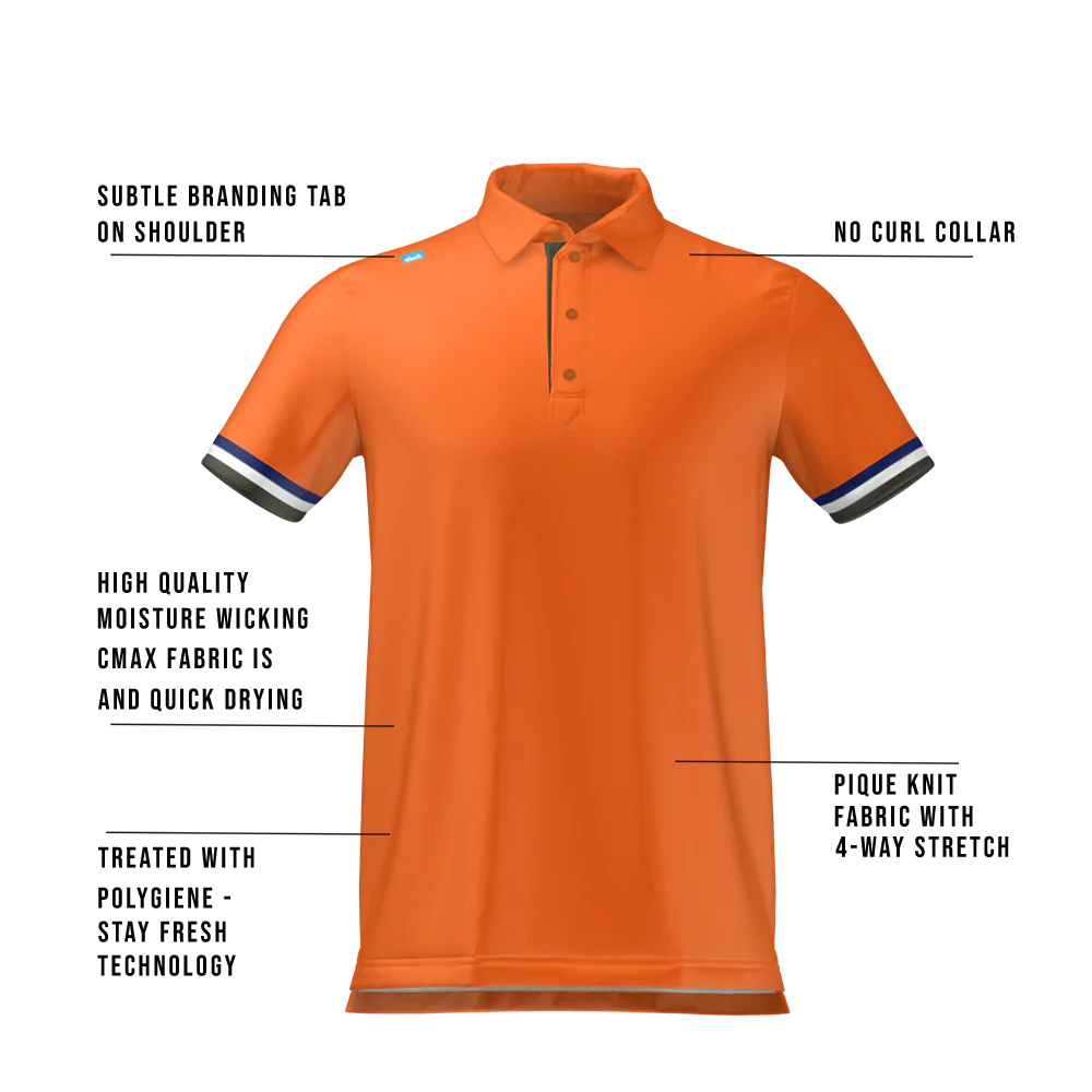 Designed with an Orange block body, featuring a Khaki, Navy and White sleeve cuff stripe and a Khaki under placket. Bunker Flag on shoulder seam for subtle branding.