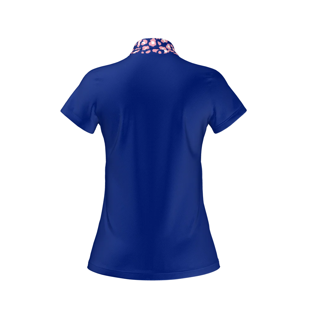 The navy block colour design, paired with the eye-catching navy and pink animal print contrast collar, adds a stylish edge to your golf wardrobe, combining performance with a bold look.