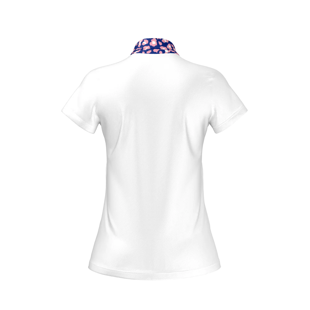 The crisp white polo, paired with a navy and pink animal print contrast collar, creates a stylish and vibrant look, perfect for standing out on the course.