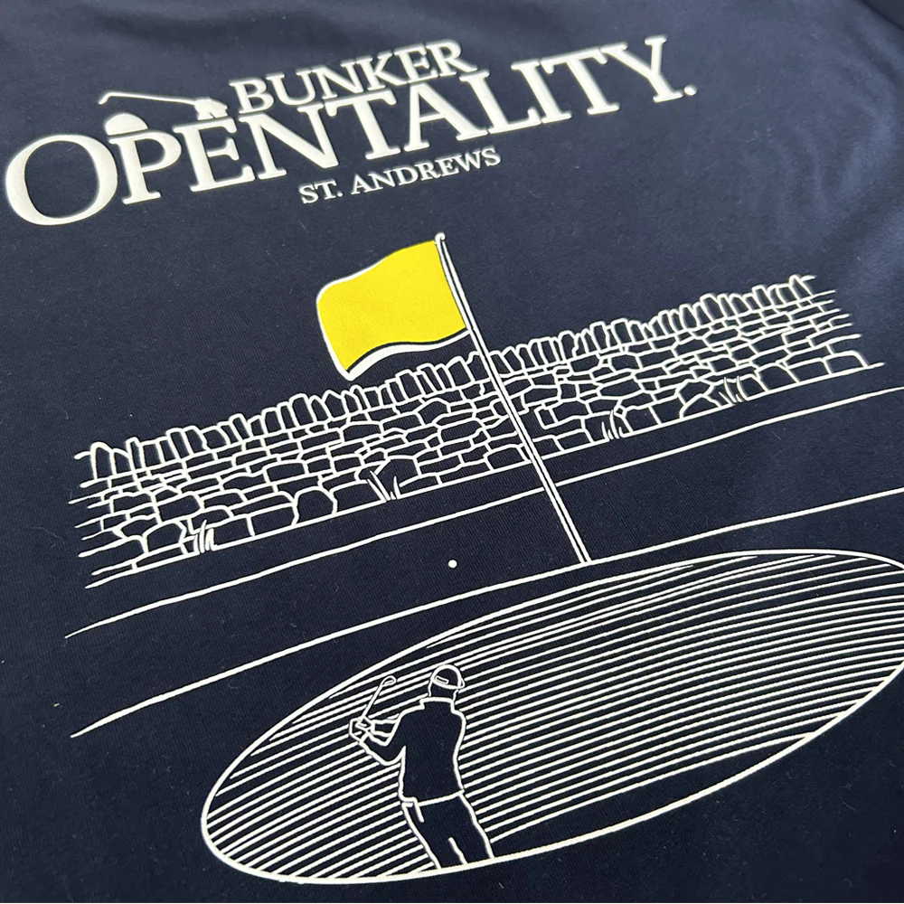 This T-shirt celebrates the 150th anniversary of The Open Championship at St. Andrews, featuring our unique hand-illustrated BUNKER graphic print of the world-renowned 17th hole.